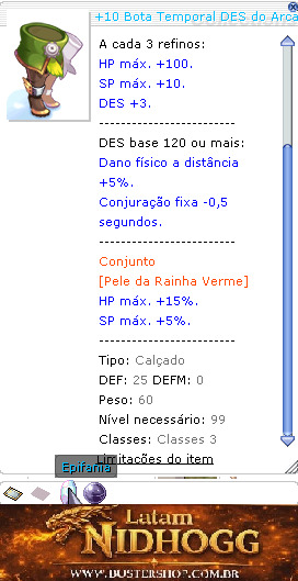Botas incríveis que devem ter sido criadas há muito tempo, mas nunca foram usadas. HP máx. +300. SP máx. +30. A cada 3 refinos: DES +3. HP máx. +100. SP máx. +10. DES base 120 ou mais: Dano físico a distância +5%. Conjuração fixa -0,5 segundos. Conjunto [Pele da Rainha Verme] HP máx. +15%. SP máx. +5%. Tipo:Calçado Defesa:25 Peso:60 Nível necessário:99 Classes:Terceiras classes