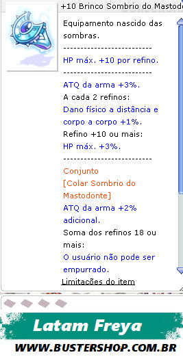 -------------------------- HP máx. +10 por refino. -------------------------- ATQ da arma +3%. A cada 2 refinos: Dano físico a distância e corpo a corpo +1%. Refino +10 ou mais: HP máx. +3%. -------------------------- Conjunto [Colar Sombrio do Mastodonte] ATQ da arma +2% adicional. Soma dos refinos 18 ou mais: O usuário não pode ser empurrado. Soma dos refinos 20 ou mais: Dano físico contra todas as propriedades +12%. --------------------------