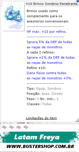 -------------------------- HP máx. +10 por refino. -------------------------- Ignora 5% da DEF de todas as raças de monstros. A cada 2 refinos: Ignora +1% da DEF de todas as raças de monstros. Refino +10 ou mais: Dano físico contra todas as raças de monstros +3%. --------------------------