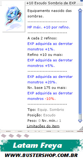 A cada refino: HP máx. +10. A cada 2 refinos: EXP adquirida ao derrotar monstros +1%. Refino +10 ou mais: EXP adquirida ao derrotar monstros +5%. -------------------------- EXP adquirida ao derrotar monstros +20%. Nv. base 170 ou mais: EXP adquirida ao derrotar monstros-10%. --------------------------