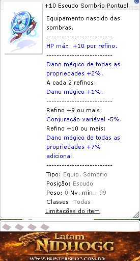 Tipo:Equip. Sombrio Posição:Escudo Peso:0Nv. mín.:99 Classes:Todas