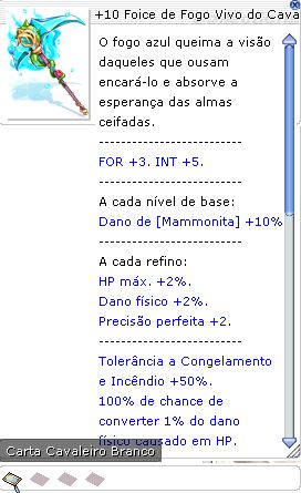 | O fogo azul queima a visão daqueles que ousam encará-lo e absorve a esperança das almas ceifadas. -------------------------- FOR +3. INT +5. -------------------------- A cada nível de base: Dano de [Mammonita] +10%. -------------------------- A cada refino: HP máx. +2%. Dano físico +2%. Precisão perfeita +2. -------------------------- Tolerância a Congelamento e Incêndio +50%. 100% de chance de converter 1% do dano físico causado em HP. Refino +7 ou mais: Conversão de HP +1% adicional. Tolerância a Congelamento e Incêndio +25% adicional. Refino +9 ou mais: Conversão de HP +2% adicional. Tolerância a Congelamento e Incêndio +25% adicional. Refino +10 ou mais: Anula a penalidade de tamanho da arma. -------------------------- A conversão de HP não é cumulativa com outros equipamentos. -------------------------- Tipo: Machado ATQ: 360 ATQM: 290 Peso: 400 Nível da arma: 4 Nível necessário: 130 Classes: Mercadores e evoluções |