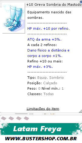 Tipo:Equip. Sombrio Posição:Grevas Peso:0Nível mín.:1 Classes:Todas
