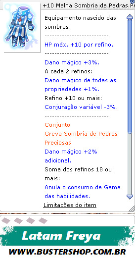 -------------------------- HP máx. +10 por refino. -------------------------- Dano mágico +3%. A cada 2 refinos: Dano mágico de todas as propriedades +1%. Refino +10 ou mais: Conjuração variável -3%. -------------------------- Conjunto [Greva Sombria de Pedras Preciosas] Dano mágico +2% adicional. Soma dos refinos 18 ou mais: Anula o consumo de Gema das habilidades. Custo de SP das habilidades+40%. Soma dos refinos 20 ou mais: Dano mágico contra todos os Tamanhos +12%. --------------------------