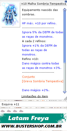 -------------------------- HP máx. +10 por refino. -------------------------- Ignora 5% da DEFM de todas as raças de monstros. A cada 2 refinos: Ignora +1% da DEFM de todas as raças de monstros. Refino +10 ou mais: Dano mágico contra todas as raças de monstros +3%. -------------------------- Conjunto [Greva Sombria Tempestiva] Dano mágico +2%. Soma dos refinos do conjunto 18 ou mais: Ignora 100% da DEFM de todas as raças de monstros. --------------------------