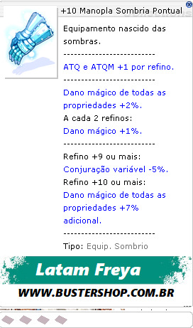 -------------------------- ATQ e ATQM +1 por refino. -------------------------- Dano físico a distância +2%. Dano físico corpo a corpo +2%. A cada 2 refinos: ATQ da arma +1%. --------------------------