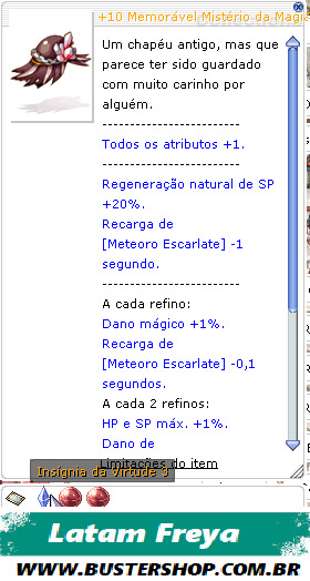 A cada refino: Dano mágico +1%. Recarga de [Meteoro Escarlate] -0,1 segundos. A cada 2 refinos: HP e SP máx. +1%. Dano de [Impacto Espiritual] +15%. -------------------------