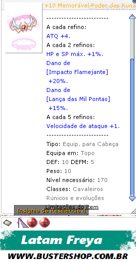 Tipo:Equip. para Cabeça Equipa em:Topo DEF:10DEFM:5 Peso:10 Nível necessário:170 Classes:Cavaleiros Rúnicos e evoluções