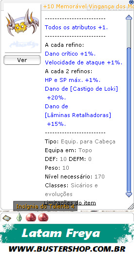 A cada refino: Dano crítico +1%. Velocidade de ataque +1%. A cada 2 refinos: HP e SP máx. +1%. Dano de [Castigo de Loki] +20%. Dano de [Lâminas Retalhadoras] +10%. --------------------------