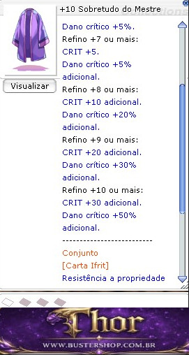Sobretudo que aumenta a percepção do usuário, ficando mais fácil acertar os pontos vitais dos inimigos. -------------------------- Indestrutível em batalha. -------------------------- HP máx. +10%. Dano crítico +5%. Refino +7 ou mais: CRIT +5. Dano crítico +5% adicional. Refino +8 ou mais: CRIT +10 adicional. Dano crítico +20% adicional. Refino +9 ou mais: CRIT +20 adicional. Dano crítico +30% adicional. Refino +10 ou mais: CRIT +30 adicional. Dano crítico +50% adicional. -------------------------- Conjunto [Carta Ifrit] Resistência a propriedade Fogo +100%. Resistência a [Ataque Crítico] dos monstros +100%. -------------------------- Tipo: Capa Defesa: 10 Peso: 30 Nível necessário: 100 Classes: Todas