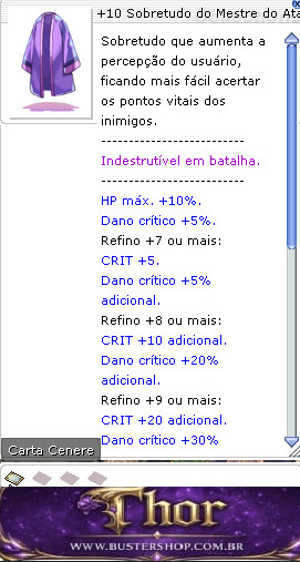 Sobretudo que aumenta a percepção do usuário, ficando mais fácil acertar os pontos vitais dos inimigos. -------------------------- Indestrutível em batalha. -------------------------- HP máx. +10%. Dano crítico +5%. Refino +7 ou mais: CRIT +5. Dano crítico +5% adicional. Refino +8 ou mais: CRIT +10 adicional. Dano crítico +20% adicional. Refino +9 ou mais: CRIT +20 adicional. Dano crítico +30% adicional. Refino +10 ou mais: CRIT +30 adicional. Dano crítico +50% adicional. -------------------------- Conjunto [Carta Ifrit] Resistência a propriedade Fogo +100%. Resistência a [Ataque Crítico] dos monstros +100%. -------------------------- Tipo: Capa Defesa: 10 Peso: 30 Nível necessário: 100 Classes: Todas