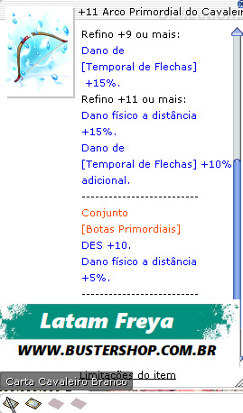 Refino +7 ou mais: Recarga de [Temporal de Flechas] -2 segundos. Refino +9 ou mais: Dano de [Temporal de Flechas] +15%. Refino +11 ou mais: Dano físico a distância +15%. Dano de [Temporal de Flechas] +10% adicional. -------------------------- Conjunto [Botas Primordiais] DES +10. Dano físico a distância +5%. --------------------------