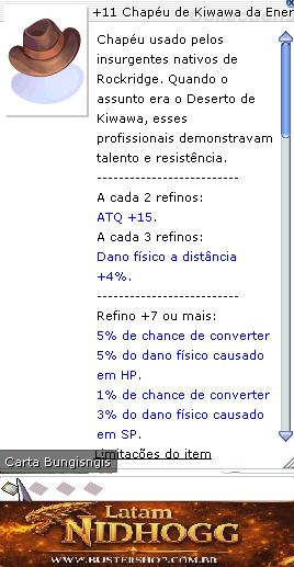 A cada 2 refinos: ATQ +15. A cada 3 refinos: Dano físico a distância +4%. --------------------------
