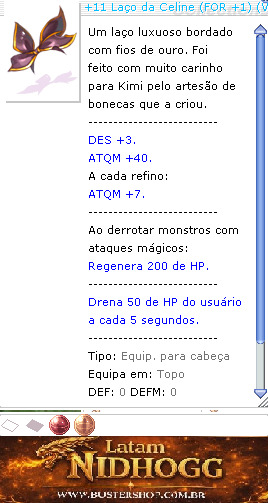 Tipo:Equip. para cabeça DEF:0DEFM:0 Peso:20 Nível necessário:1 Classes:Todas