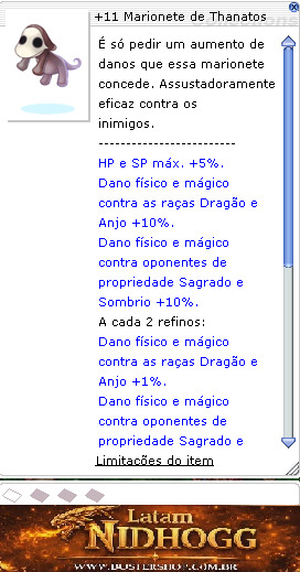 ------------------------- HP e SP máx. +5%. Dano físico e mágico contra as raças Dragão e Anjo +10%. Dano físico e mágico contra oponentes de propriedade Sagrado e Sombrio +10%. A cada 2 refinos: Dano físico e mágico contra as raças Dragão e Anjo +1%. Dano físico e mágico contra oponentes de propriedade Sagrado e Sombrio +1%. -------------------------