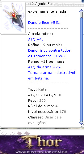 Tipo:Katar ATQ:270ATQM:0 Peso:200 Nível da arma:4 Nível necessário:170 Classes:Sicários e evoluções