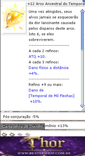 Uma vez atingidos, seus alvos jamais se esquecerão da dor lancinante causada pelos disparos deste arco. Isto é, se eles sobreviverem. ATQ +10 a cada 2 refinos. A cada 3 refinos: Dano físico a distância +4%. Refino +9 ou mais: Dano de [Temporal de Mil Flechas] +10%. Refino +11 ou mais: Recarga de [Temporal de Mil Flechas] -2 segundos. Conjunto [Botas Ancestrais] Ao realizar ataques físicos: 3% de chance de ativar um [efeito] por 7 segundos. Efeito: DES +20. Dano com Arco +20%. Tipo: Arco Ataque: 180 Peso: 100 Nível da arma: 4 Nível necessário: 100 Classes: Renegados, Arqueiros e evoluções