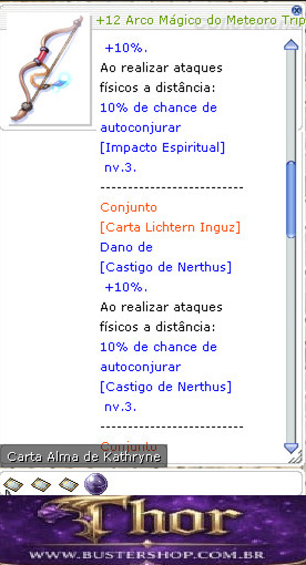 Refino +7 ou mais: Dano mágico contra todos os tamanhos +7%. Refino +9 ou mais: Dano mágico contra oponentes de todas as propriedades +10%. Refino +11 ou mais: Dano mágico +5%. Ignora 15% da DEFM de todas as raças. -------------------------- Conjunto [Carta Lichtern Anzus] Dano de [Impacto Espiritual] +10%. Ao realizar ataques físicos a distância: 10% de chance de autoconjurar [Impacto Espiritual] nv.3. -------------------------- Conjunto [Carta Lichtern Inguz] Dano de [Castigo de Nerthus] +10%. Ao realizar ataques físicos a distância: 10% de chance de autoconjurar [Castigo de Nerthus] nv.3. -------------------------- Conjunto [Carta Lichtern Kenaz] Dano de [Meteoro Escarlate] +10%. Ao realizar ataques físicos a distância: 10% de chance de autoconjurar [Meteoro Escarlate] nv.3. -------------------------- Conjunto [Carta Lichtern Laguz] Dano de [Pó de Diamante] +10%. Ao realizar ataques físicos a distância: 10% de chance de autoconjurar [Pó de Diamante] nv.3. -------------------------- Conjunto [Carta Tikbalang] Dano de [Corrente Elétrica] +10%. Ao realizar ataques físicos a distância: 10% de chance de autoconjurar [Corrente Elétrica] nv.3. -------------------------- Conjunto [Carta Plaga] Dano de [Onda Psíquica] +10%. Ao realizar ataques físicos a distância: 10% de chance de autoconjurar [Onda Psíquica] nv.3.