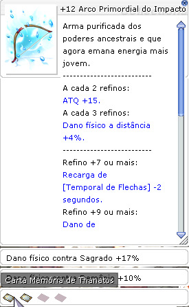 Arma purificada dos poderes ancestrais e que agora emana energia mais jovem. -------------------------- A cada 2 refinos: ATQ +15. A cada 3 refinos: Dano físico a distância +4%. -------------------------- Refino +7 ou mais: Recarga de [Temporal de Mil Flechas] -2 segundos. Refino +9 ou mais: Dano de [Temporal de Mil Flechas] +15%. Refino +11 ou mais: Dano físico a distância +15%. Dano de [Temporal de Mil Flechas] +10% adicional. -------------------------- Tipo: Arco ATQ: 210 ATQM: 0 Peso: 100 Nível da arma: 4 Nível necessário: 150 Classes: Trovadores, Musas e evoluções