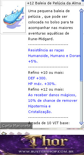 Uma pequena baleia de pelúcia , que pode ser colocada no bolso para te acompanhar nas maiores aventuras aquáticas de Rune-Midgard. -------------------------- Resistência as raças Humanoide, Humano e Doram +5%. -------------------------- Refino +10 ou mais: DEF +300. HP máx. +30%. Refino +12 ou mais: Ao receber danos mágicos, 10% de chance de remover Hipotermia e Cristalização. -------------------------- A cada de 10 VIT base: Resistência a propriedade Água +7%. -------------------------- A cada refino: Resistência a propriedade Fantasma +3%. -------------------------- Tipo: Capa DEF: 0 DEFM: 0 Peso: 40 Nível necessário: 100 Classes: Todas