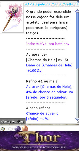 O grande poder escondido nesse cajado faz dele um artefato ideal para lançar poderosos (e perigosos) feitiços. Indestrutível em batalha. ATQM +130. Ao aprender [Chamas de Hela] nv. 5: Dano de [Chamas de Hela] +100%. Refino +1 ou mais: Ao usar [Chamas de Hela], 4% de chance de ativar um [efeito] por 5 segundos. A cada refino: Dano de [Chamas de Hela] +10%. Chance de ativar o [efeito] +4%. A cada refino até o +10: Ignora 5% da DEFM de monstros normais e Chefes. Efeito: Conjuração variável de [Chamas de Hela] -30%. Tipo: Cajado Ataque: 0 Peso: 60 Nível da arma: 4 Nível necessário: 90 Classes: Arcanos