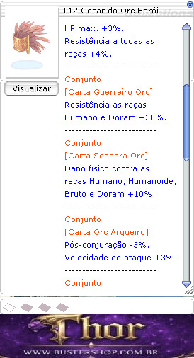 Não existe maneira de ficar mais imponente do que usando o Cocar do Orc Herói. O brilho dourado emitido pelo equipamento pode ser visto de muito longe e serve como um sinal de alerta aos inimigos. -------------------------- Indestrutível em batalha. -------------------------- DEFM +10. Todos os atributos +1. -------------------------- A cada 4 refinos: HP máx. +3%. Resistência a todas as raças +4%. -------------------------- Conjunto [Carta Guerreiro Orc] Resistência as raças Humano e Doram +30%. -------------------------- Conjunto [Carta Senhora Orc] Dano físico contra as raças Humano, Humanoide, Bruto e Doram +10%. -------------------------- Conjunto [Carta Orc Arqueiro] Pós-conjuração -3%. Velocidade de ataque +3%. -------------------------- Conjunto [Carta Senhor dos Orcs] HP máx. +50%. Tolerância a Congelamento e Petrificação +100%. -------------------------- Conjunto [Carta Orc Herói] HP máx. +20%. Habilita [Força Violentíssima] nv.5. -------------------------- Desequipar o conjunto cancela [Força Violentíssima]. -------------------------- Conjunto [Carta Guerreiro Orc] [Carta Senhora Orc] [Carta Orc Arqueiro] [Carta Senhor dos Orcs] [Carta Orc Herói] Mantém [Investigar] ativo. Habilita [Aura Sagrada] nv.4. -------------------------- Investigar: Anula a defesa física do alvo. Aumenta o ataque igual a 50% da defesa anulada. Efeitos de ignorar defesa são aplicados antes de [Investigar]. -------------------------- Tipo: Equipamento para Cabeça Equipa em: Topo Defesa: 50 Peso: 50 Nível necessário: 1 Classes: Todas