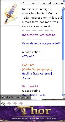 Intimidar os inimigos nunca foi tão fácil! Com a Toda Poderosa em mãos, até o mais forte dos monstros vai se curvar a você. -------------------------- Indestrutível em batalha. -------------------------- Velocidade de ataque +10% -------------------------- A cada refino: ATQ +10. -------------------------- Conjunto [Carta Doppelganger] Habilita [Lex Aeterna] nv.1. - Nv. base 99: A cada refino: Dano físico +4%. Velocidade de ataque +2%. - Nv. base 100 ou mais: A cada refino: Dano físico +10%. Velocidade de ataque +5%. -------------------------- Tipo: Espada de Duas Mãos ATQ: 300 ATQM: 0 Peso: 220 Nível da arma: 4 Nível necessário: 99 Classes: Espadachins e evoluções