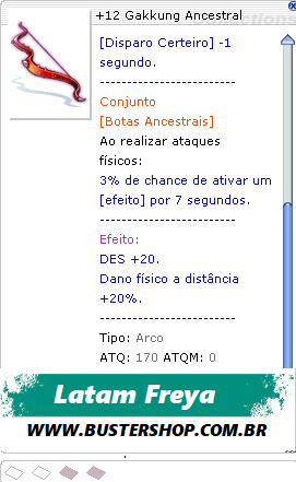 Arco de cor vermelha tão intensa que é confundido com as escamas de dragões ancestrais. A cada 2 refinos: ATQ +10. ------------- A cada 3 refinos: Pós-conjuração -4%. ----------------------- Refino +9 ou mais: Dano de [Disparo Certeiro] +35%. ------------------------ [Conjunto] [Botas Ancestrais] Ao realizar ataques físicos: 3% de chance de ativar um [efeito] por 7 segundos. ---------------------- Efeito: DES +20. Dano físico a distância +20%. Tipo: Arco ATQ: 170 ATQM: 0 Peso: 80 Nível da arma: 4 Nível necessário: 100 Classes: Sentinelas e evoluções