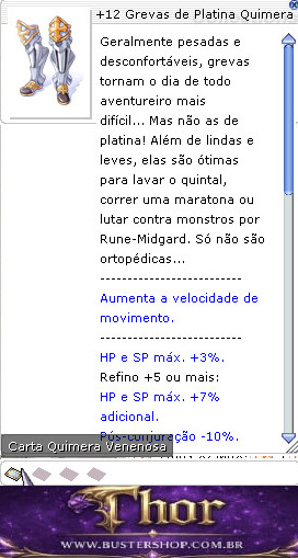 Geralmente pesadas e desconfortáveis, grevas tornam o dia de todo aventureiro mais difícil... Mas não as de platina! Além de lindas e leves, elas são ótimas para lavar o quintal, correr uma maratona ou lutar contra monstros por Rune-Midgard. Só não são ortopédicas...