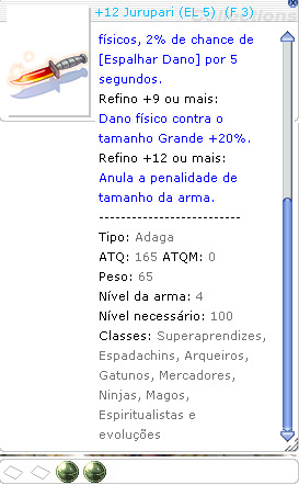 Tipo:Adaga ATQ:165ATQM:0 Peso:65 Nível da arma:4 Nível necessário:100 Classes:Superaprendizes, Espadachins, Arqueiros, Gatunos, Mercadores, Ninjas, Magos, Espiritualistas e evoluções