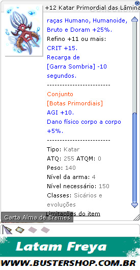 Refino +7 ou mais: Dano crítico +15%. Velocidade de ataque +10%. Refino +9 ou mais: Dano físico contra as raças Humano, Humanoide, Bruto e Doram +25%. Refino +11 ou mais: CRIT +15. Recarga de [Garra Sombria] -10 segundos. -------------------------- Conjunto [Botas Primordiais] AGI +10. Dano físico corpo a corpo +5%. --------------------------