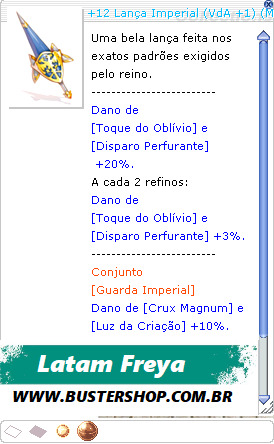 Uma bela lança feita nos exatos padrões exigidos pelo reino. ATQM +40. Dano de [Disparo Perfurante] e [Toque do Oblívio] +20%. A cada 2 refinos: Dano de [Disparo Perfurante] e [Toque do Oblívio] +3%. Ao equipar a Guarda Imperial: Dano de [Crux Magnun] e [Luz da Criação] +10%. Tipo : Lança de Uma Mão Força de Ataque : 180 Peso : 180 Nível da Arma : 3 Nível Necessário : 102 Classe : Guardião Real