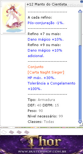 A vestimenta perfeita, costurada sob medida para aventureiros que desejam subir a Torre da Constelação. -------------------------- Indestrutível em batalha. -------------------------- HP e SP máx. +15%. -------------------------- A cada refino: Pós-conjuração -1%. -------------------------- Refino +7 ou mais: Dano mágico +10%. Refino +9 ou mais: Dano mágico +10% adicional. -------------------------- Conjunto [Carta Naght Sieger] HP máx. +30%. Tolerância a Congelamento +100%. -------------------------- Tipo: Armadura DEF: 40 DEFM: 15 Peso: 90 Nível necessário: 100 Classes: Todas