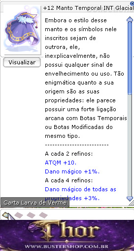 Embora o estilo desse manto e os símbolos nele inscritos sejam de outrora, ele, inexplicavelmente, não possui qualquer sinal de envelhecimento ou uso. Tão enigmática quanto a sua origem são as suas propriedades: ele parece possuir uma forte ligação arcana com Botas Temporais ou Botas Modificadas do mesmo tipo.