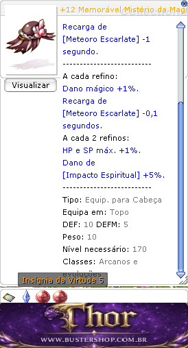 Um chapéu antigo, mas que parece ter sido guardado com muito carinho por alguém. -------------------------- Todos os atributos +1. -------------------------- Regeneração natural de SP +20%. Recarga de [Meteoro Escarlate] -1 segundo. -------------------------- A cada refino: Dano mágico +1%. Recarga de [Meteoro Escarlate] -0,1 segundos. A cada 2 refinos: HP e SP máx. +1%. Dano de [Impacto Espiritual] +5%. -------------------------- Tipo: Equip. para Cabeça Equipa em: Topo DEF: 10 DEFM: 5 Peso: 10 Nível necessário: 170 Classes: Arcanos e evoluções
