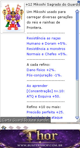 Um Mikoshi usado para carregar diversas gerações do reis e rainhas de Prontera. -------------------------- Resistência as raças Humano e Doram +5%. Resistência a monstros Normais e Chefes +5%. -------------------------- A cada refino: Dano físico +2%. Pós-conjuração -1%. -------------------------- Ao aprender [Concentração] nv.10: ATQ e Esquiva +50. -------------------------- Refino +10 ou mais: Precisão perfeita +25. Velocidade de ataque +10%. Refino +12 ou mais: Se não possuir [Concentração], a habilita em nv.10. -------------------------- Tipo: Capa DEF: 40 DEFM: 0 Peso: 40 Nível necessário: 100 Classes: Todas