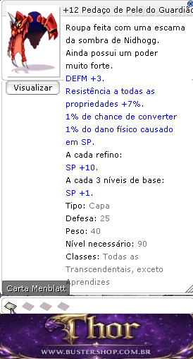 Roupa feita com uma escama da sombra de Nidhogg. Ainda possui um poder muito forte. DEFM +3. Resistência a todas as propriedades +7%. 1% de chance de converter 1% do dano físico causado em SP.