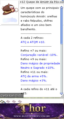 Um quepe com as principais características do homúnculo Amistr: orelhas e rabo felpudos, chifres afiados e um sino bem barulhento. ATQ e ATQM +10 a cada 2 refinos. Refino +7 ou mais: Conjuração variável -10%. Refino +9 ou mais: Dano mágico de propriedade Neutro e Sagrado +10%. Refino +11 ou mais: ATQ da arma +5%. Dano mágico +3%. A cada refino do +11 até o +15: Conjuração fixa -0,1 segundo. Conjunto [Vara Sagrada] A cada 2 refinos da arma: ATQM +10. Dano de [Adoramus] +30%. Conjunto Tipo: Equipamento para Cabeça Equipa em: Topo Defesa: 15 Peso: 20 Nível necessário: 1 Classes: Todas