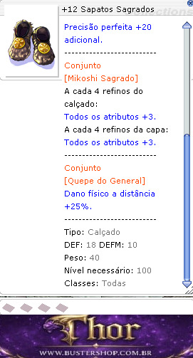 Sapatos muito confortáveis utilizados por Reis e Rainhas de Prontera. Diz uma antiga lenda que uma tal de "Mikoshi" torna estes calçados ainda mais poderosos !. -------------------------- Pós-conjuração -30%. -------------------------- Precisão perfeita +10. Refino +7 ou mais: Precisão perfeita +20 adicional. Refino +9 ou mais: Precisão perfeita +20 adicional. -------------------------- Conjunto [Mikoshi Sagrado] A cada 4 refinos do calçado: Todos os atributos +3. A cada 4 refinos da capa: Todos os atributos +3. -------------------------- Conjunto [Quepe do General] Dano físico a distância +25%. -------------------------- Tipo: Calçado DEF: 18 DEFM: 10 Peso: 40 Nível necessário: 100 Classes: Todas