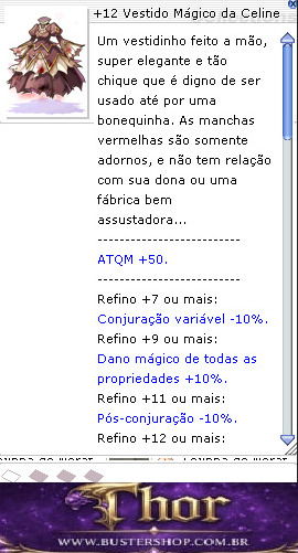 Um vestidinho feito a mão, super elegante e tão chique que é digno de ser usado até por uma bonequinha. As manchas vermelhas são somente adornos ,e não tem relação com sua dona ou uma fabrica bem assustadora... -------------------------- ATQM +50. -------------------------- Refino +7 ou mais: Conjuração variável -10%. Refino +9 ou mais: Dano mágico de todas as propriedades +10%. Refino +11 ou mais: Pós-conjuração -10%. Refino +12 ou mais: Pós-conjuração -5% adicional. -------------------------- Conjunto [Laço da Celine] A cada refino do Laço: Dano mágico de propriedade Sagrado, Sombrio, Veneno e Fantasma +1%. A cada refino da Armadura: Dano mágico de propriedade Sagrado, Sombrio, Veneno e Fantasma +1%. Soma dos refinos +19 ou mais: Dano mágico +15%. Soma dos refinos +23 ou mais: Dano mágico de todas as propriedades +20% adicional. -------------------------- Conjunto [Adereço da Celine] A cada refino da Armadura: ATQM +10. Armadura com refino +9 ou mais: Conjuração variável -5%. Armadura com refino +11 ou mais: Dano mágico de propriedade Água, Vento, Terra, Fogo e Neutro +10%. Armadura com refino +13 ou mais: Torna a armadura indestrutível em batalha. -------------------------- Conjunto [Luva dos Espíritos Malignos] Dano mágico +10%. Precisão perfeita +10. Dano mágico contra todos os Tamanhos +15%. Ao realizar ataques físicos: 5% de chance de ativar um [efeito] por 10 segundos. -------------------------- Efeito: Dano mágico contra todas as raças de monstros +15%. -------------------------- Tipo: Armadura DEF: 40 DEFM: 0 Peso: 50 Nível necessário: 130 Classes: Todas