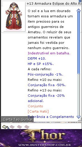 O sol e a lua em dourado tornam essa armadura um item precioso para os antigos guerreiros de Amatsu. O reluzir de seus ornamentos revelam que jamais foi vestida por nenhum outro guerreiro.