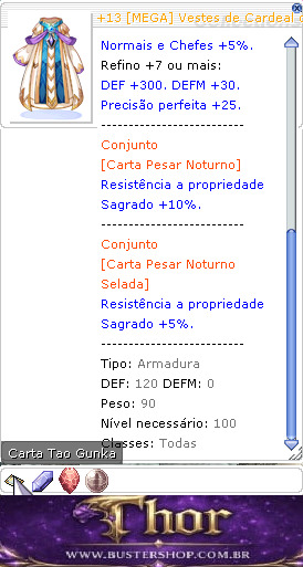 Manto sagrado usado pelos cardeais do Santuário de Freya. -------------------------- Indestrutível em batalha. -------------------------- Velocidade de ataque +10%. Dano físico e mágico contra todos os Tamanhos +40%. -------------------------- A cada refino: Resistência a propriedade Fantasma +2%. -------------------------- Refino +5 ou mais: Resistência a monstros Normais e Chefes +5%. Refino +7 ou mais: DEF +300. DEFM +30. Precisão perfeita +25. -------------------------- Conjunto [Carta Pesar Noturno] Resistência a propriedade Sagrado +10%. -------------------------- Conjunto [Carta Pesar Noturno Selada] Resistência a propriedade Sagrado +5%. -------------------------- Tipo: Armadura DEF: 120 DEFM: 0 Peso: 90 Nível necessário: 100 Classes: Todas