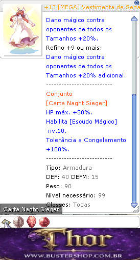 Vestes feitas com um tecido tão macio e confortável que pode confundir o usuário com algum fantasma. Tem uma gostosa sensação de calor. -------------------------- Indestrutível em batalha. -------------------------- HP e SP máx. +15%. Pós-conjuração -10%. -------------------------- Refino +7 ou mais: Dano mágico contra oponentes de todos os Tamanhos +20%. Refino +9 ou mais: Dano mágico contra oponentes de todos os Tamanhos +20% adicional. -------------------------- Conjunto [Carta Naght Sieger] HP máx. +50%. Habilita [Escudo Mágico] nv.10. Tolerância a Congelamento +100%. -------------------------- Tipo: Armadura DEF: 40 DEFM: 15 Peso: 90 Nível necessário: 100 Classes: Todas