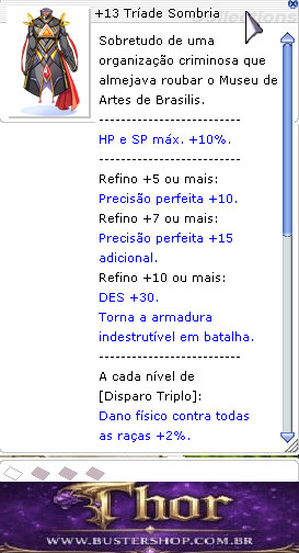 Sobretudo de uma organização criminosa que almejava roubar o Museu de Artes de Brasilis. -------------------------- HP e SP máx. +10%. -------------------------- Refino +5 ou mais: Precisão perfeita +10. Refino +7 ou mais: Precisão perfeita +15 adicional. Refino +10 ou mais: DES +30. Torna a armadura indestrutível em batalha. -------------------------- A cada nível de [Disparo Triplo]: Dano físico contra todas as raças +2%. -------------------------- A cada nível de [Redemoinho de Absorção]: AGI +10. ATQ +50. -------------------------- Ao aprender [Desejo das Sombras] nv.10: Ao usar [Disparo Triplo], 3% de chance de ativar o efeito de [Ilimitar] nv.5 por 5 segundos. -------------------------- Desequipar o item cancela o efeito de [Ilimitar]. -------------------------- Tipo: Armadura DEF: 100 DEFM: 0 Peso: 100 Nível necessário: 100 Classes: Todas