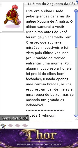 Este era o elmo usado pelos grandes generais do antigo Xogum de Amatsu. O último samurai a vestir esse elmo antes de você foi um gaijin chamado Tom Crusoé, que adorava missões impossíveis e foi visto pela última vez indo pra Pirâmide de Morroc enfrentar uma múmia. Por algum motivo estranho, ele foi pra lá de olhos bem fechados, usando apenas uma camisa branca, óculos escuros, um par de meias e uma roupa de baixo, mas se achando um grande ás indomável.