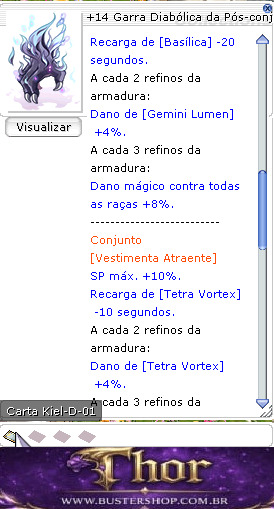 Refino +7 ou mais: Pós-conjuração -8%. Conjuração variável -8%. Refino +9 ou mais: Dano físico a distância +10%. Dano físico corpo a corpo +10%. Dano mágico de todas as propriedades +10%. Refino +11 ou mais: Conjuração fixa -0,2 segundos. Ao receber danos físicos ou mágicos, 10% de chance de infligir Medo. -------------------------- Conjunto [Vestimenta Arrogante] CRIT +30. Recarga de [Basílica] -20 segundos. A cada 2 refinos da armadura: Dano de [Gemini Lumen] +4%. A cada 3 refinos da armadura: Dano mágico contra todas as raças +8%. -------------------------- Conjunto [Vestimenta Atraente] SP máx. +10%. Recarga de [Tetra Vortex] -10 segundos. A cada 2 refinos da armadura: Dano de [Tetra Vortex] +4%. A cada 3 refinos da armadura: Dano mágico contra todas as raças +8%. -------------------------- Conjunto [Vestimenta Exuberante] DEFM +25. Recarga de [Erva Daninha] -1,5 segundos. A cada 2 refinos da armadura: Dano de [Erva Daninha] +4%. A cada 3 refinos da armadura: Dano físico contra todas as raças +8%. -------------------------- Conjunto [Vestimenta Consulente] HP máx. +10%. Recarga de [Ataque Selvagem] -20 segundos. A cada 2 refinos da armadura: Dano de [Ataque Selvagem] +4%. A cada 3 refinos da armadura: Dano físico contra todas as raças +8%. --------------------------