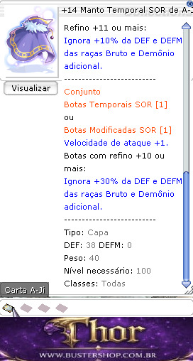Embora o estilo desse manto e os símbolos nele inscritos sejam de outrora, ele, inexplicavelmente, não possui qualquer sinal de envelhecimento ou uso. Tão enigmática quanto a sua origem são as suas propriedades: ele parece possuir uma forte ligação arcana com Botas Temporais ou Botas Modificadas do mesmo tipo. -------------------------- A cada 2 refinos: CRIT +3. Dano crítico +3%. A cada 4 refinos: Velocidade de ataque +5%. -------------------------- Refino +7 ou mais: ATQ da arma +7%. Refino +9 ou mais: Ignora 20% da DEF e DEFM das raças Bruto e Demônio. Refino +11 ou mais: Ignora +10% da DEF e DEFM das raças Bruto e Demônio adicional. -------------------------- Conjunto Botas Temporais SOR [1] ou Botas Modificadas SOR [1] Velocidade de ataque +1. Botas com refino +10 ou mais: Ignora +30% da DEF e DEFM das raças Bruto e Demônio adicional. -------------------------- Tipo: Capa Defesa: 38 Peso: 40 Nível necessário: 100 Classes: Todas