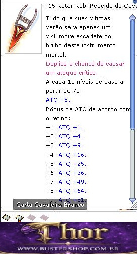 Tudo que suas vítimas verão será apenas um vislumbre escarlate do brilho deste instrumento mortal. Duplica a chance de causar um ataque crítico. A cada 10 níveis de base a partir do 70: ATQ +5. Bônus de ATQ de acordo com o refino: +1:ATQ +1. +2: ATQ +4. +3: ATQ +9. +4: ATQ +16. +5: ATQ +25. +6: ATQ +36. +7: ATQ +49. +8: ATQ +64. +9: ATQ +81. +10: ATQ +100. +11: ATQ +121. +12: ATQ +144. +13: ATQ +169. +14: ATQ +196. +15: ATQ +225. Tipo: Katar Ataque: 130 Peso: 130 Nível da arma: 3 Nível necessário: 70 Classes: Mercenários e evoluções