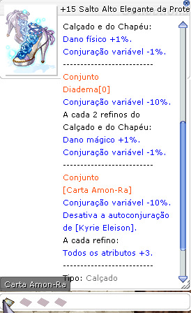 Um par de sandálias chiquérrimas com saltos tão altos quanto a finesse de quem os calça. Saber andar com um destes aqui é só pra quem pode! -------------------------- DEFM +10. A cada refino: Pós-conjuração -2%. -------------------------- Conjunto [Coroa[0]] Conjuração variável -10%. A cada 2 refinos do Calçado e do Chapéu: Dano físico +1%. Conjuração variável -1%. -------------------------- Conjunto [Diadema[0]] Conjuração variável -10%. A cada 2 refinos do Calçado e do Chapéu: Dano mágico +1%. Conjuração variável -1%. -------------------------- Conjunto [Carta Amon-Ra] Conjuração variável -10%. Desativa a autoconjuração de [Kyrie Eleison]. A cada refino: Todos os atributos +3. -------------------------- Tipo: Calçado Defesa: 7 Peso: 20 Nível necessário: 99 Classes: Todas
