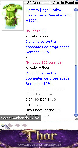 Uma couraça tão resistente quanto um Orc determinado. É feita com um material capaz de parar qualquer lâmina e conter as chamas de um dragão. -------------------------- Indestrutível em batalha. -------------------------- Pós-conjuração -10%. -------------------------- A cada refino: Reflete 1% dos danos físicos recebidos. -------------------------- Refino +7 ou mais: Dano físico +10%. Refino +9 ou mais: Dano físico +10% adicional. -------------------------- Conjunto [Carta Senhor dos Orcs] Mantém [Vigor] ativo. Tolerância a Congelamento +100%. - Nv. base 99: A cada refino: Dano físico contra oponentes de propriedade Sombrio +3%. - Nv. base 100 ou mais: A cada refino: Dano físico contra oponentes de propriedade Sombrio +10%. -------------------------- Tipo: Armadura DEF: 90 DEFM: 10 Peso: 90 Nível necessário: 99 Classes: Todas